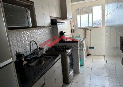 O imóvel tem 61 metros quadrados, 2 dormitórios com suíte, 1 banheiro, sala ampla, cozinha, lavanderia, varanda gourmet e 1 vaga coberta.